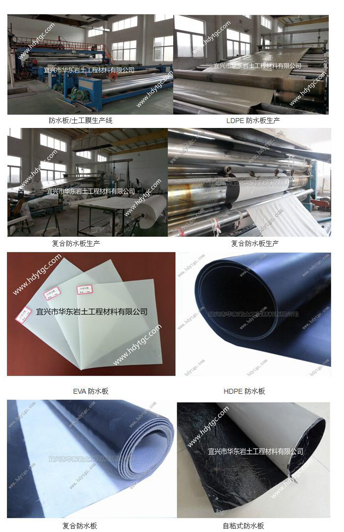 三、復合防水板:由高分子EVA/PE片材與短纖針刺土工布或者長絲針刺土工布復合而成。